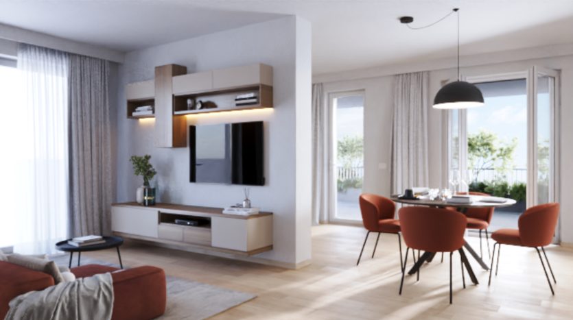 Trilocale, nuova costruzione in un’area di recente sviluppo, caratterizzata da ampi spazi verdi e facilmente accessibile a tutti i principali servizi, composto da 2 bagni finestrati, 2 camere da letto, un soggiorno con cucina a vista che si affaccia su un terrazzo arredabile. Pompa di calore sia per il riscaldamento autonomo a pavimento che per la produzione di acqua calda sanitaria e il raffrescamento mediante split ad espansione diretta inclusi, impianto fotovoltaico personale, zanzariere, tapparelle elettriche. Possibilità di personalizzare gli ambienti con pavimenti e rivestimenti secondo capitolato. Ottime finiture. Edificio privo di barriere architettoniche. Possibilità di garage di mq 18 € 25.000 e posti auto a € 5.000 cad.